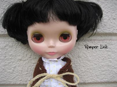 といってもただブライスサイズに四角く編んで、それに違う色の毛糸で結ぶ紐をつけただけの話ですが(汗)